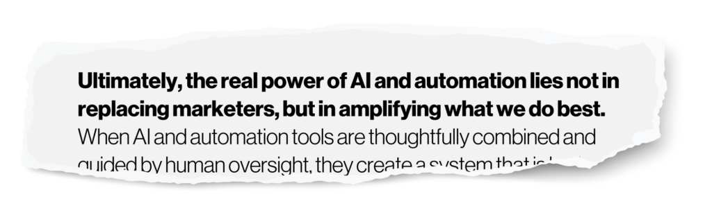 Ultimately, the real power of AI and automation lies not in replacing marketers, but in amplifying what we do best. When AI and automation tools are thoughtfully combined and guided by human oversight, they create a system that is both efficient and resilient. By applying the right level of control, marketers can avoid the pitfalls of overreliance on AI while still benefiting from its speed and analytical strength. The end goal is to make the tech work for us, freeing human intelligence to focus on strategy, creativity and judgment where it matters most.
